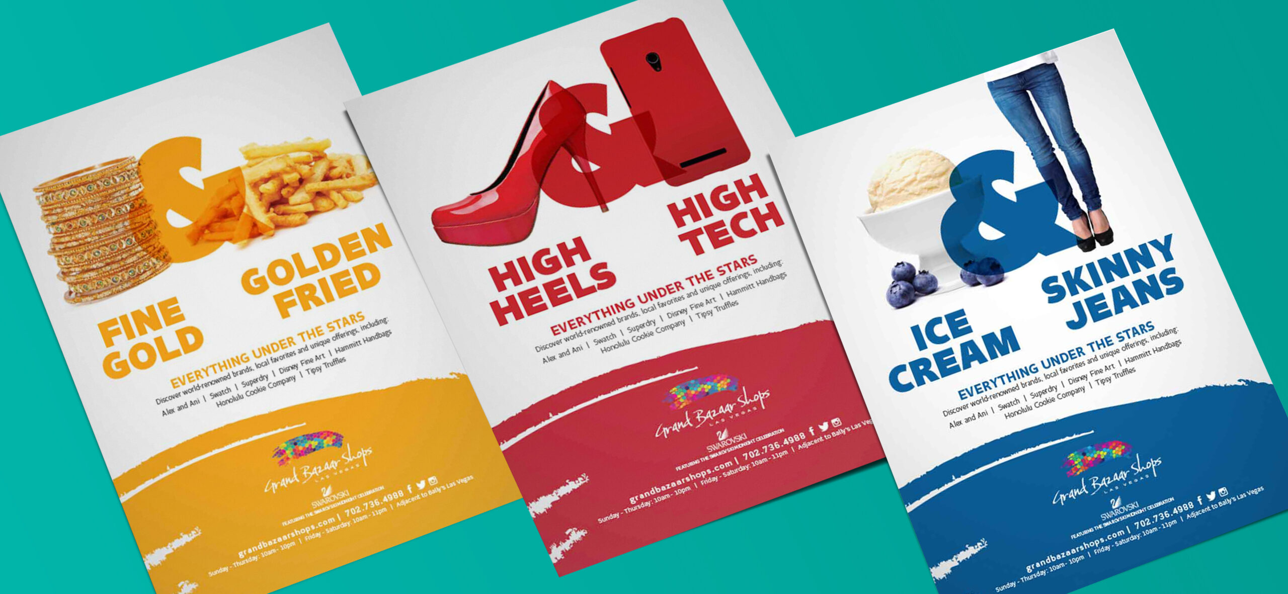 To connect with potential shoppers and grow awareness of the new retail destination, we created a number of digital and print ads that were used in a variety of media buys. The ad’s tagline, “Everything Under the Stars,” was further illustrated by the far-ranging shops available at the Grand Bazaar Shops. These colorful ads jumped off the page, perfect for a Las Vegas shopping experience.